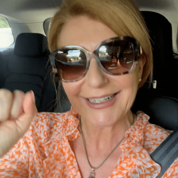 Woman smiling in car, wearing sunglasses.