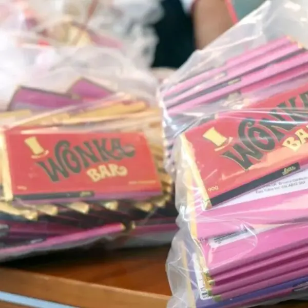 Stacks of Wonka Bars in plastic bags.